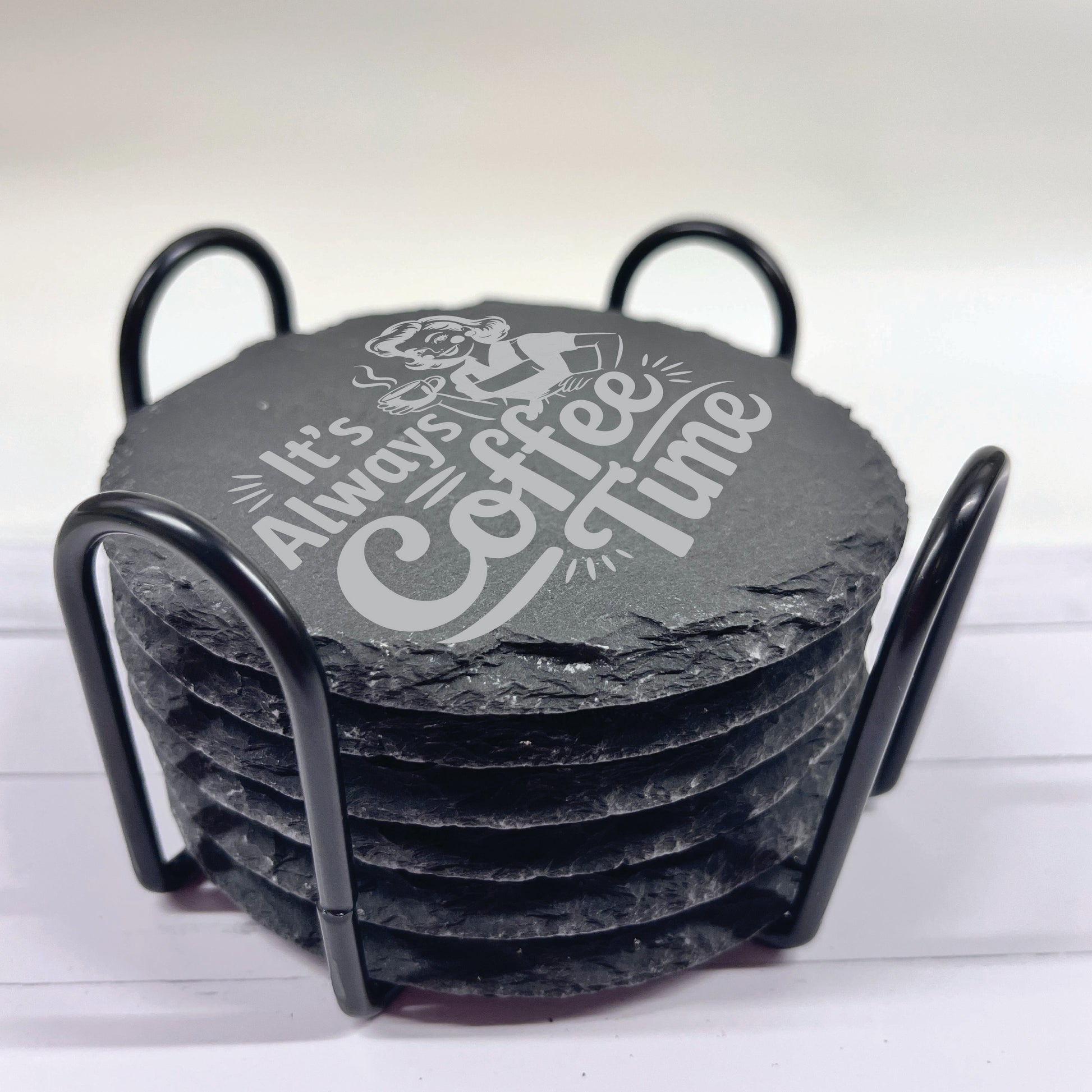 Coffee Lovers Slate Stone Coasters | Set of Six Round or Square & Metal Holder | Funny Coffee Sayings