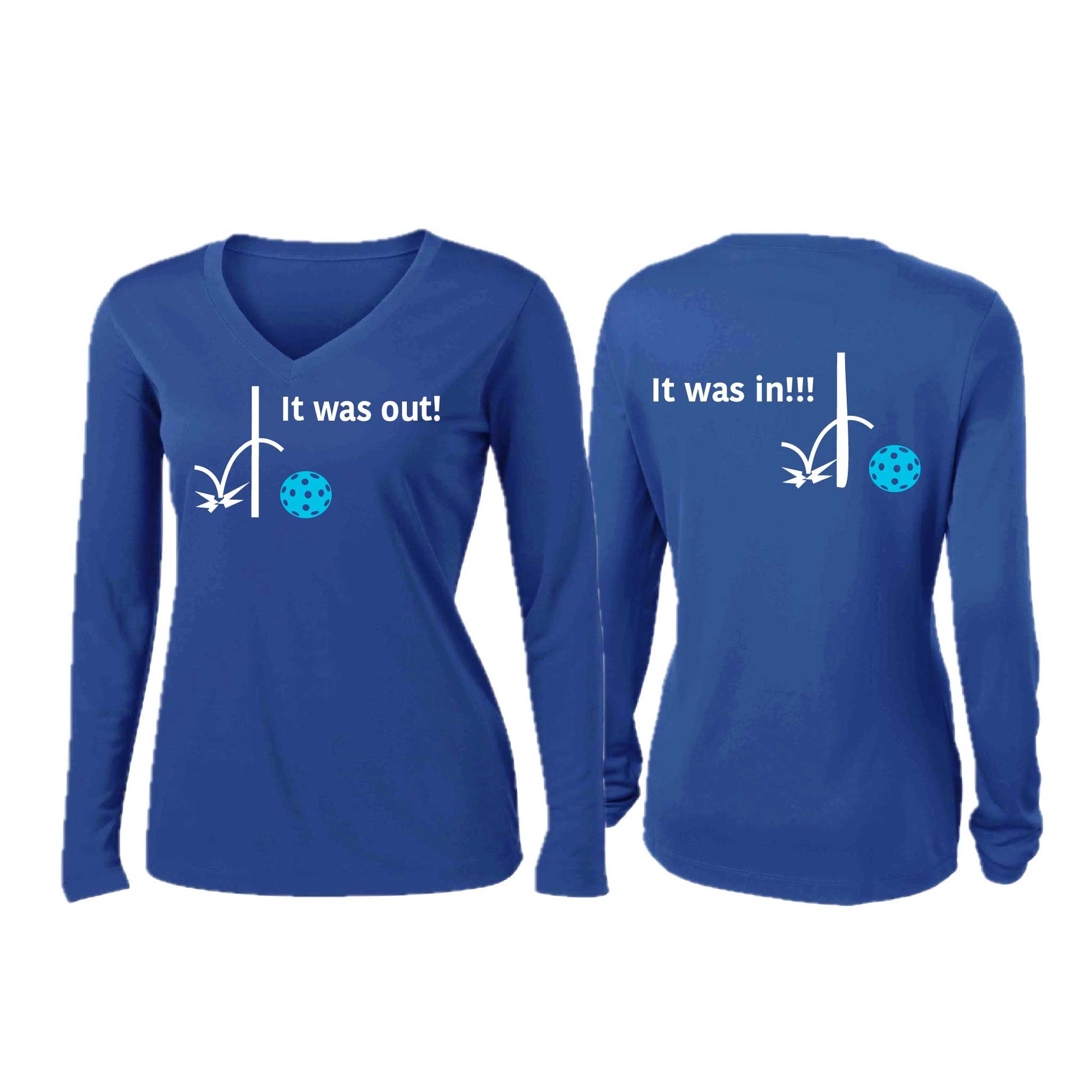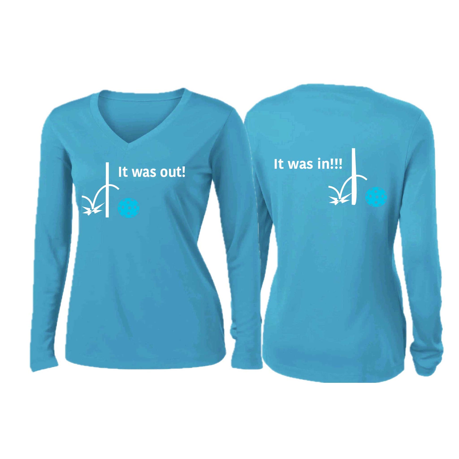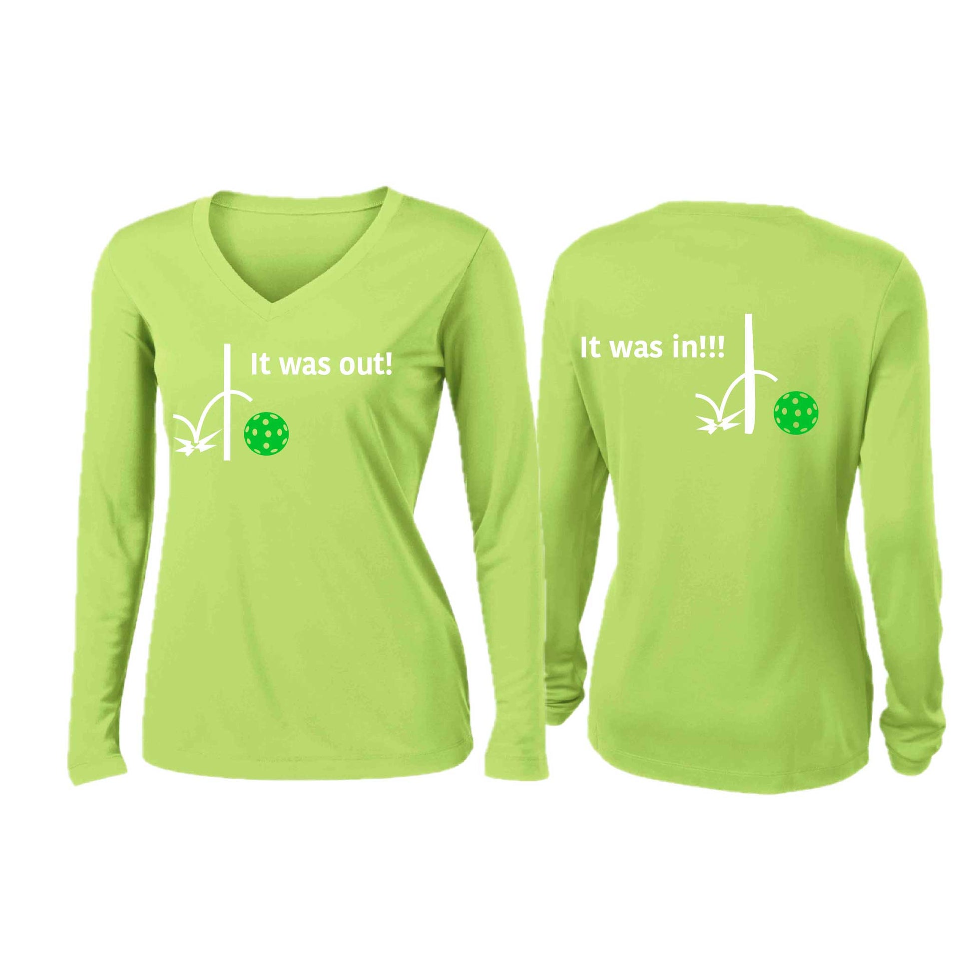 It Was Out! It Was In! (Pickleballs Cyan Green Orange) | Women’s Long Sleeve V-Neck Pickleball Performance T-Shirt | 100% Polyester