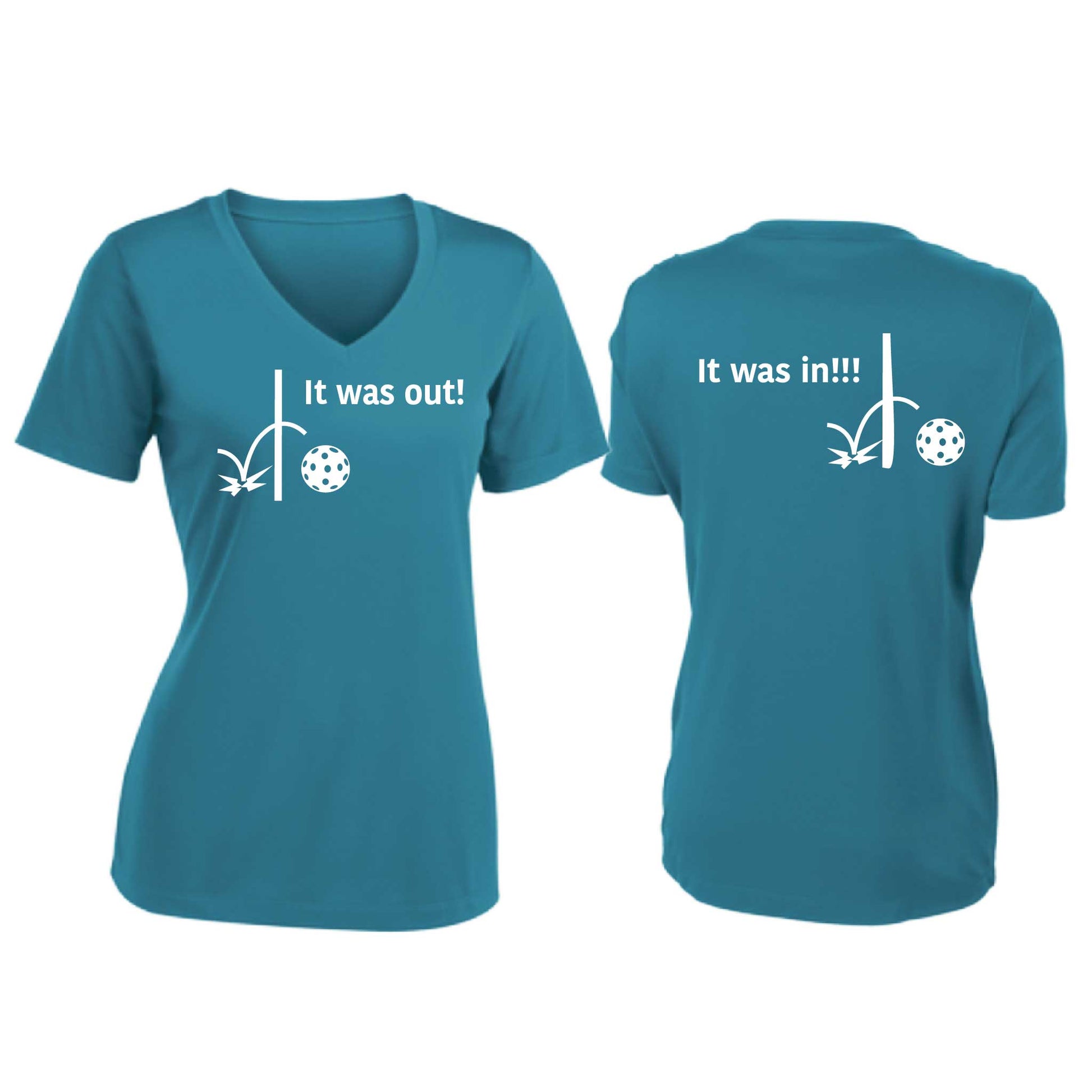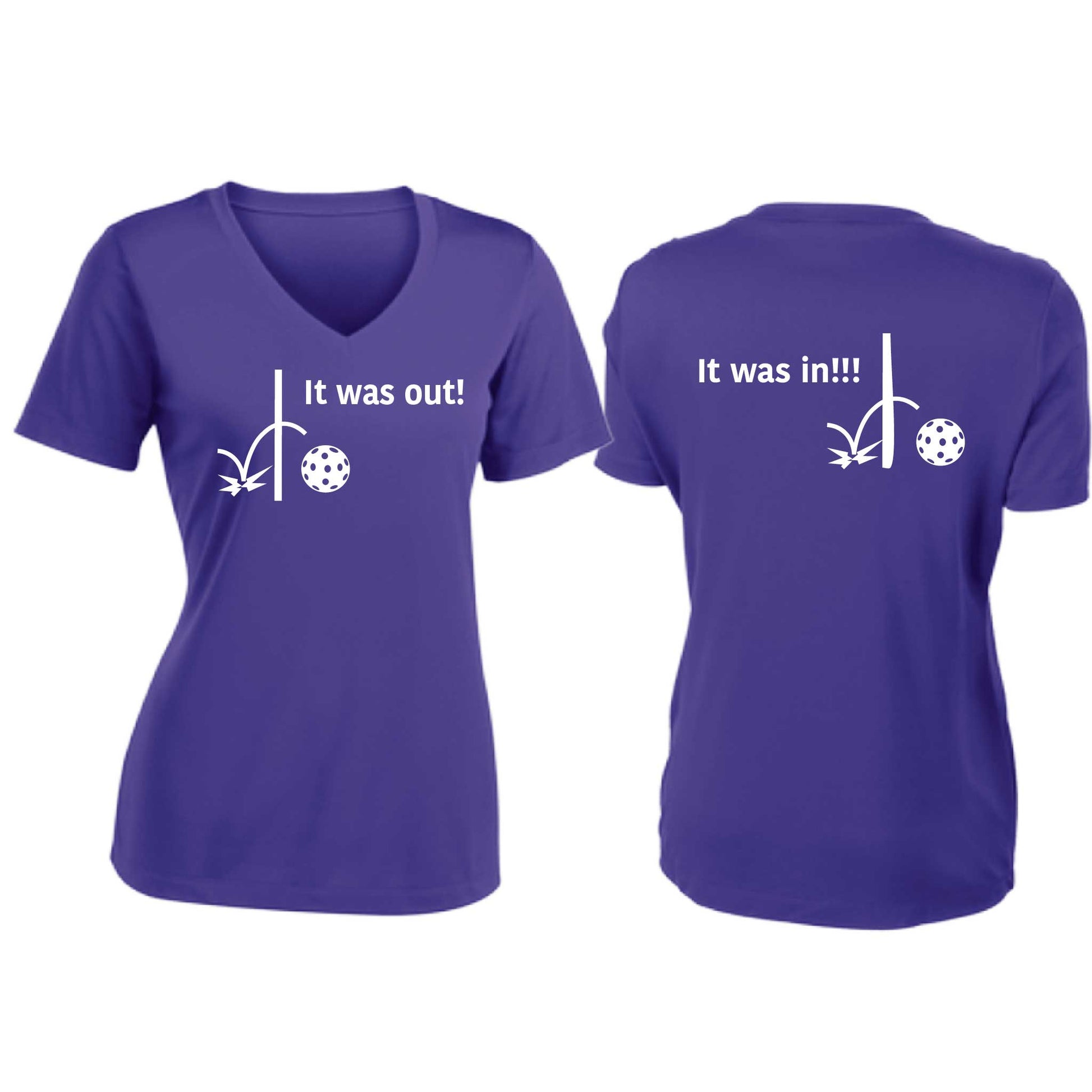 It Was Out! It Was In! (Pickleballs Red White Yellow) | Women's Short Sleeve V-Neck Pickleball T-Shirts | 100% Polyester