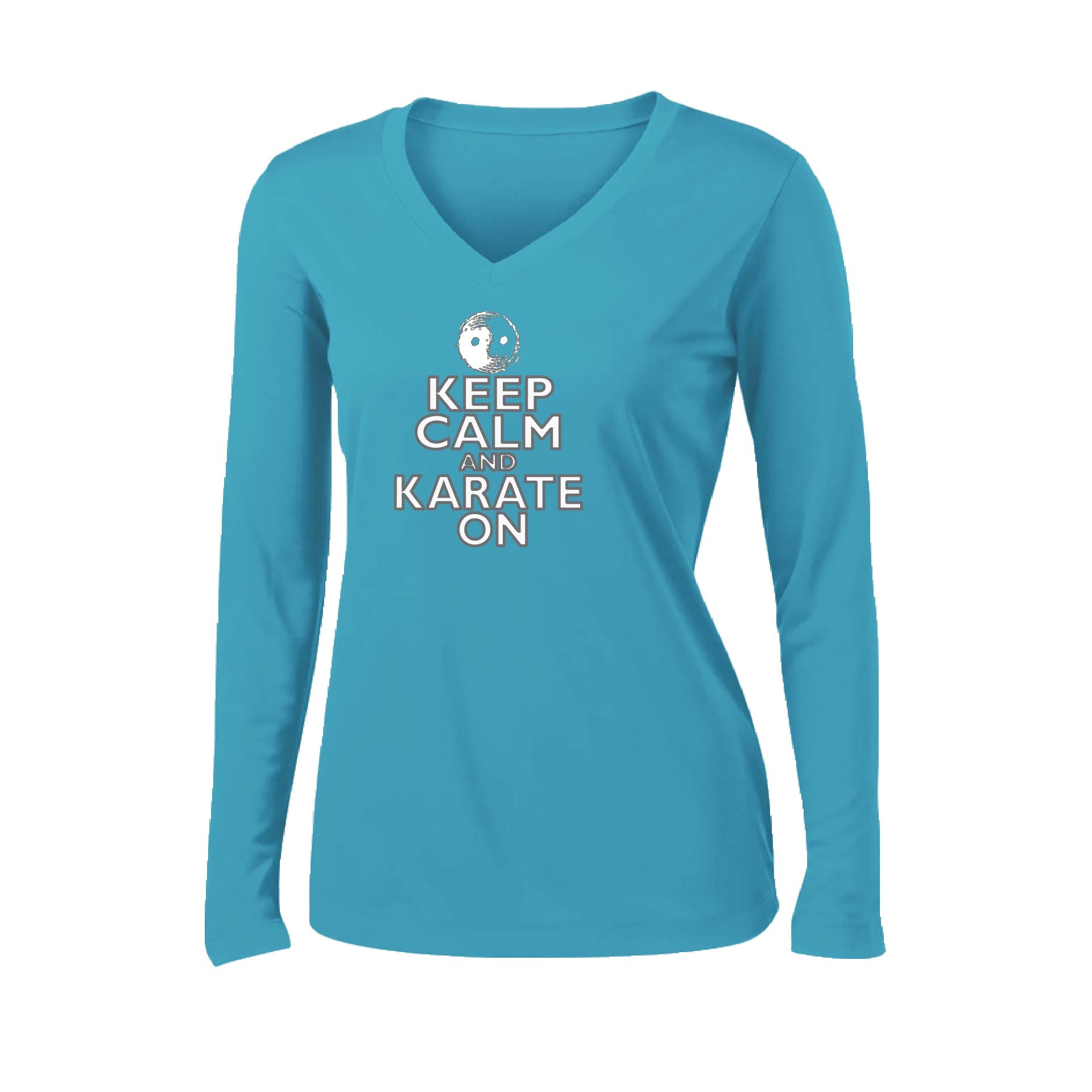 Keep Calm and Karate On (Grey Outlined) | Women’s Long Sleeve V-Neck Karate Performance T-Shirt | 100% Polyester