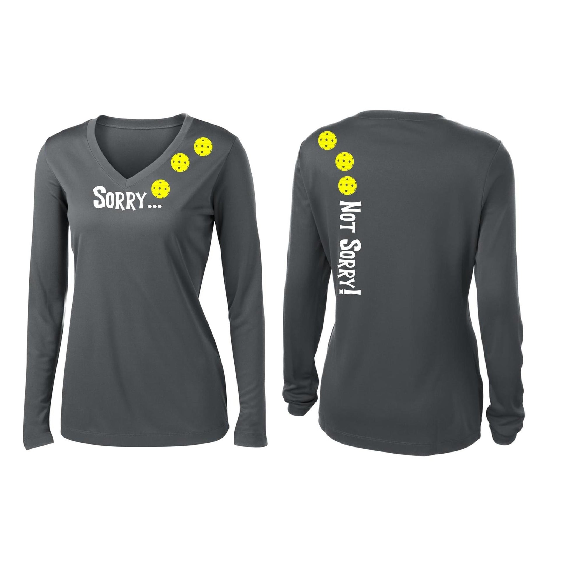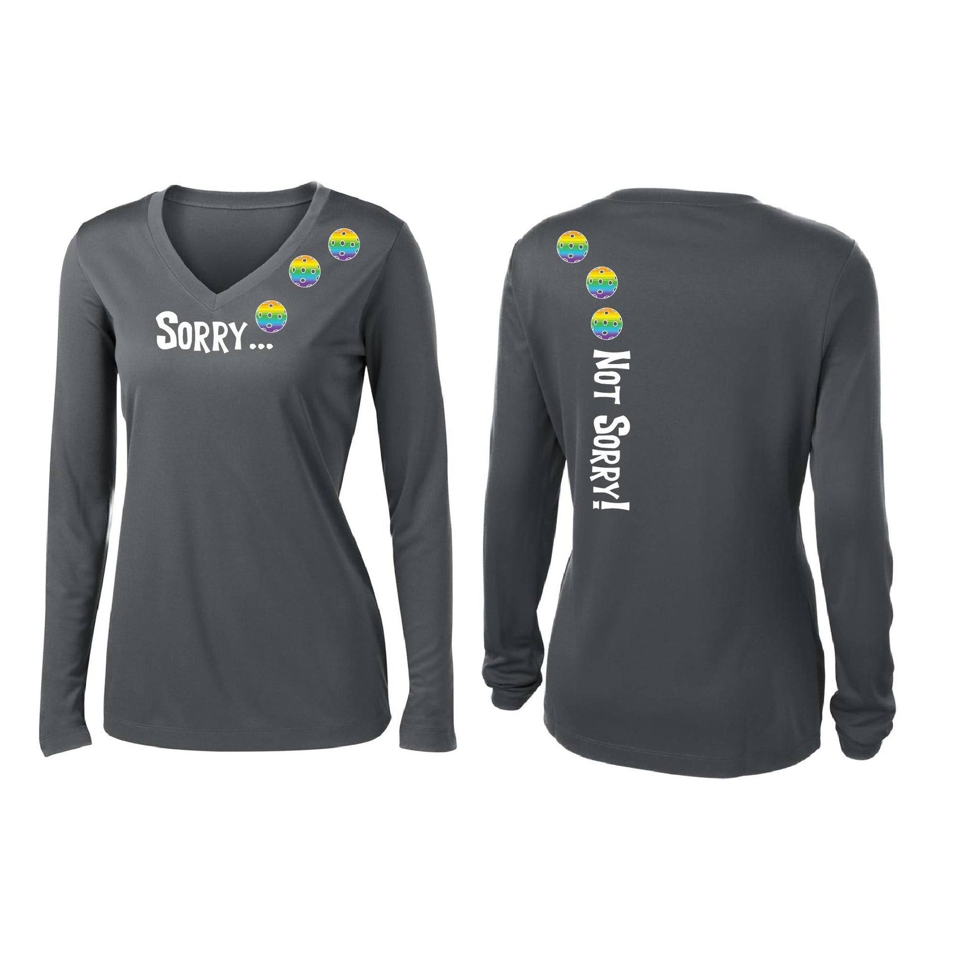 Sorry Not Sorry (Customizable 10 Pickleball Colors) | Women’s Long Sleeve V-Neck Pickleball Performance T-Shirt | 100% Polyester